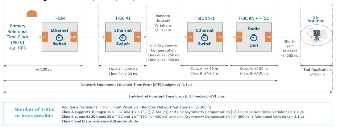 For class C and D clocks, study is ongoing with respect to end-to-end timing budgets. For example, class C allows double the number of hops in theory, but can also allow looser specs for link asymmetry compensation or PRTC performance. Class C and D clocks are expected to be required in fronthaul network cluster configurations to ensure that relative time error requirements are met between RUs when there are multiple hops between the local PRTC at the CU and DU and the RUs.