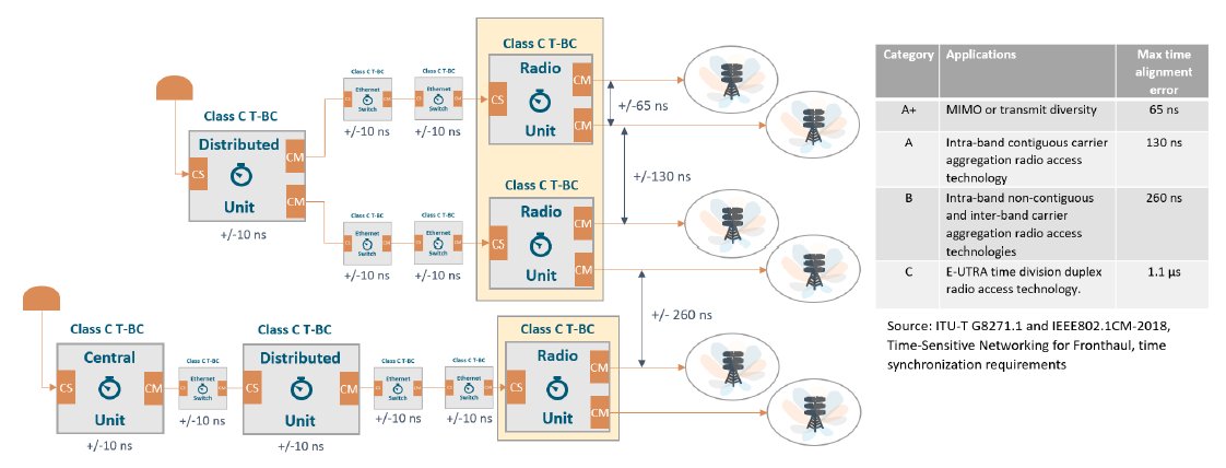The additional PRTC sources can be at the CU or the DU and there can be multiple hops to the RU. For this reason, it is assumed that class C T-BCs will be required in the fronthaul to meet the relative timing requirements.