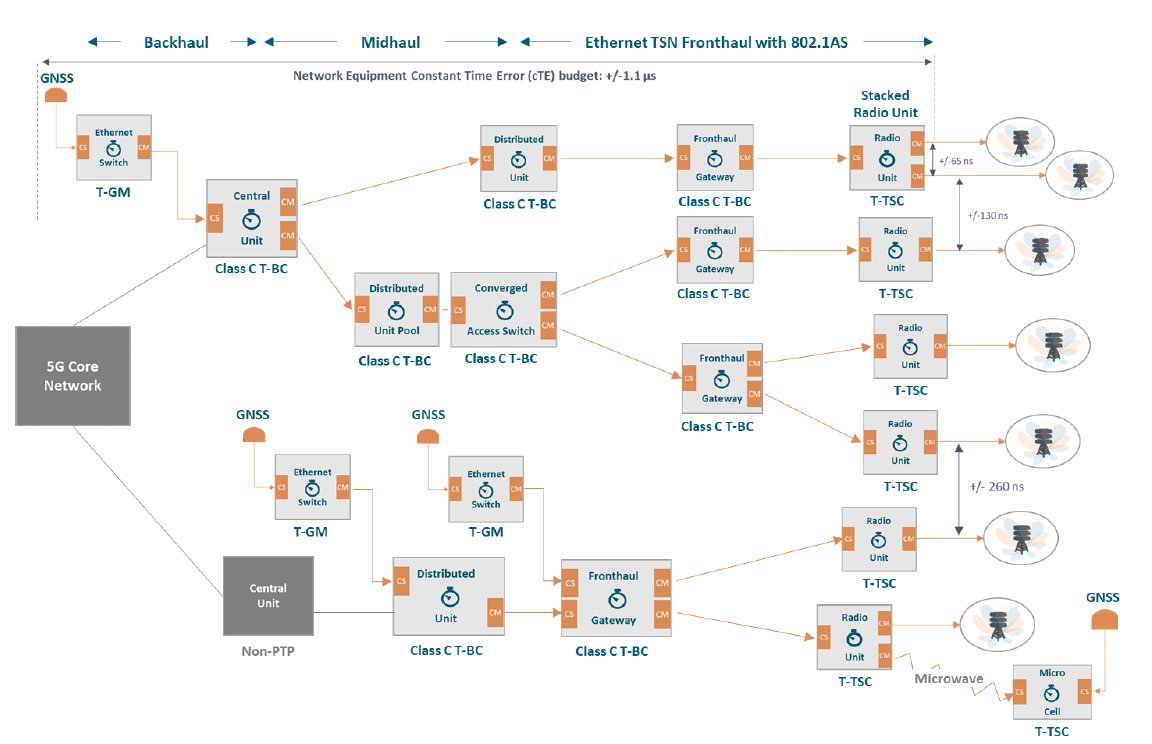 IEEE 802.1CM is an Ethernet TSN profile for Time- Sensitive Networking for mobile Fronthaul networks including 5G. From a timesynchronization perspective, IEEE 802.1CM assumes the use of IEEE 802.1AS and includes latency requirements that are important to consider. The requirements are closely aligned with ITU-T specifications for network limits for time synchronization in packet networks with full timing (G.8271.1), which means that Synchronous Ethernet physical layer frequency synchronization is also required in this standard.