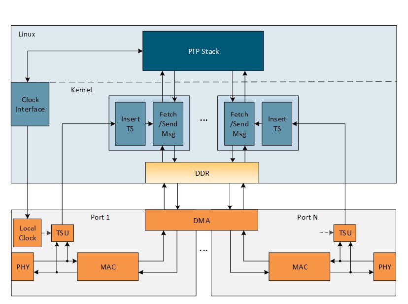 Multiple ports are supported using generic values defined in the hardware register, XML configuration file or via the management interface. The timestamp is inserted by the driver software with the local clock controlled by the PTP software stack via the kernel.