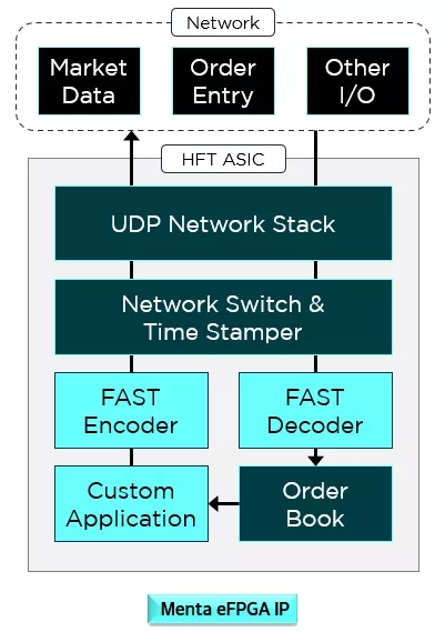 At the final stage, execution and order management systems must handle order placement, acknowledgments, modifications, and cancellations across multiple venues with deterministic, ultra-low latency. Every nanosecond impacts execution quality and profitability. Traditional software introduces jitter, while fixed ASICs cannot keep up with rapidly changing exchange protocols and new order types. Menta eFPGA provides a unique solution by embedding adaptable execution logic directly into the ASIC, ensuring consistent nanosecond-level performance with the ability to reprogram routing policies, order types, or venue-specific protocol handlers in real time. This integration minimizes serialization delays, reduces system complexity, and positions trading firms to adapt seamlessly to future market structure changes, regulatory shifts, or novel execution mechanisms.