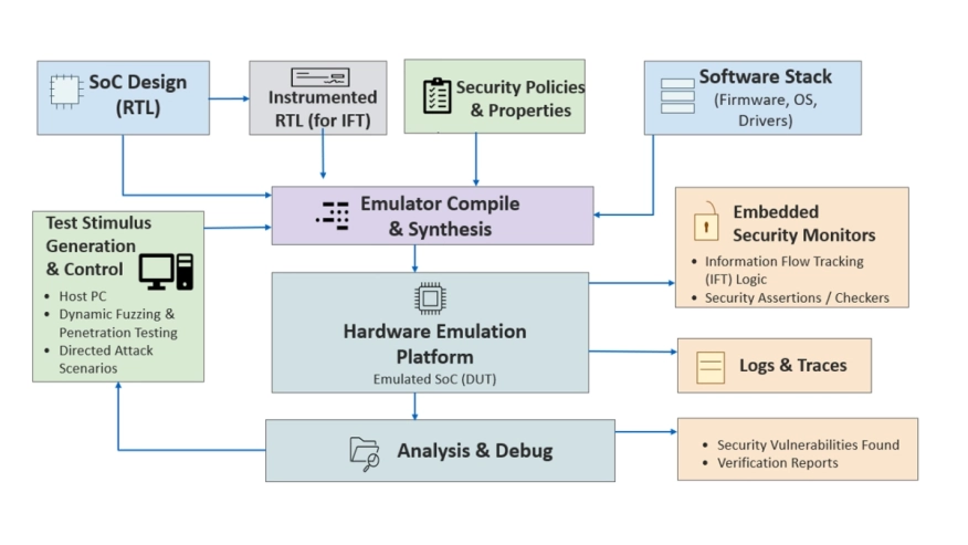 Keywords: Hardware emulation, SoC security, pre-silicon validation, fuzzing, fault injection, in formation flow tracking, hardware vulnerability analysis.