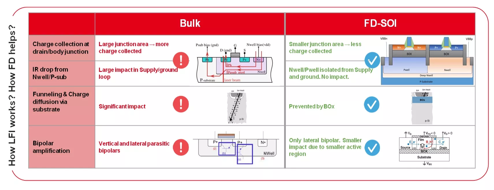 FD-SOI, with an ultra-thin silicon film electrically isolated from the handle wafer by the BOX, directly addresses this need by removing silicon-substrate conduits that LFI exploits in bulk CMOS. Beyond passive resilience, FD-SOI’s body-biasing gives designers an active knob to harden devices during certification or secure modes, aligning with “security by design” expectations.