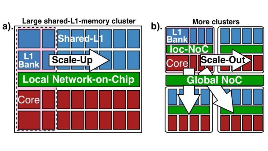 - TeraPool: A Physical Design Aware, 1024 RISC-V Cores Shared-L1-Memory Scaled-up Cluster Design with High Bandwidth Main Memory Link