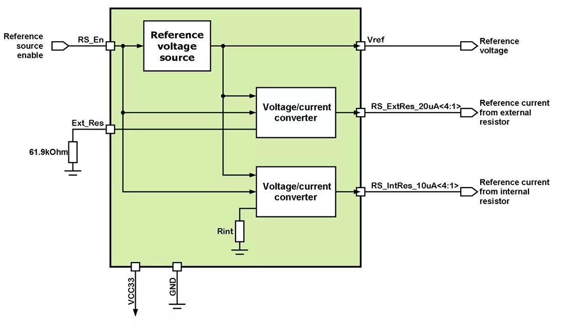 055TSMC_RS_02 consists of bandgap voltage reference and two voltage-to-current converters: one of them is based on external resistor and thus could be considered as process and temperature independed current reference; the other is based on internal resistor and follows its process and temperature variations.