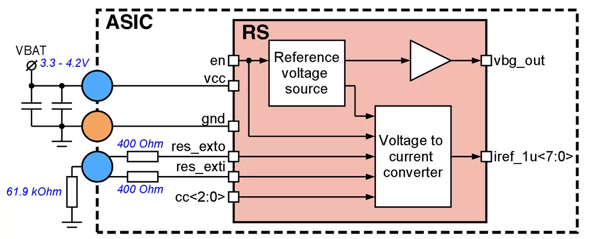 180XFAB_RS_01 consists of a bandgap reference voltage regulator, formed temperature and power supply variations independent voltage and bias, formed reference currents for internal analog blocks based on an external resistor 69.1kΩ. The block starts to operate after power up on 3.3V to 4.2V voltage and en = “1”. The RS is capable to output one reference voltage for analog blocks vbg_out 1.22V without trimming feature. Typical reference current iref_1u is 1uA. It should be noted that nominal values of reference current inversely depend on the external resistor.