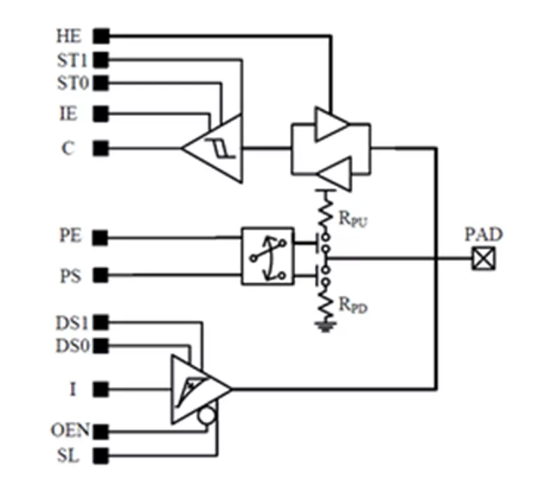 Supported features include core isolation, programmable slew rate compensation, programmable drive strength, input/output enable, pull select and pull enable. Extra features such as programmable hysteresis can be supported upon request.