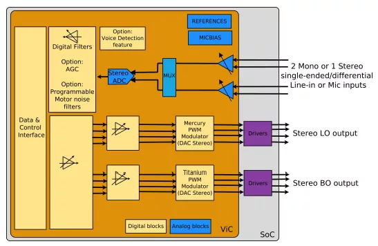 sCODp-MT1-VD.02, is a new generation of audio converter ensuring optimal sound detection and recording with the most types of analog microphones for smart home appliance application. Its high dynamic range ADC combined with a voice detection feature make such an IP very appreciated for its voice recognition capabilities. It combines small area with low EMI emission.