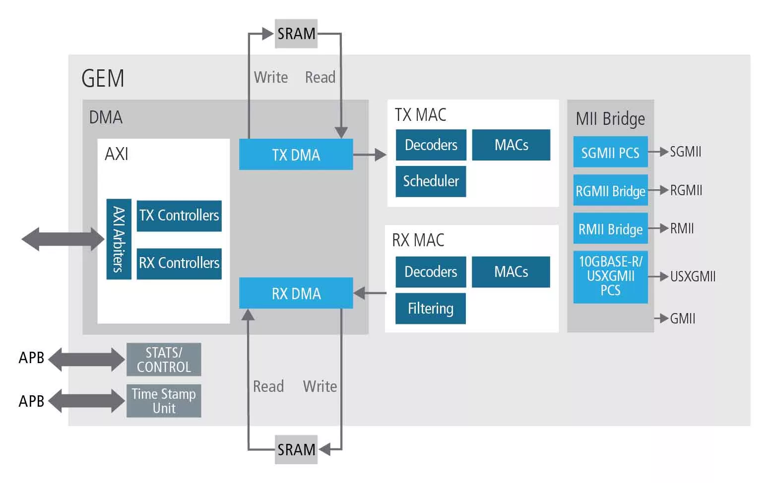 - High-performance DMA with advanced AXI offloading capabilities and descriptor caching, QoS, and IEEE1588