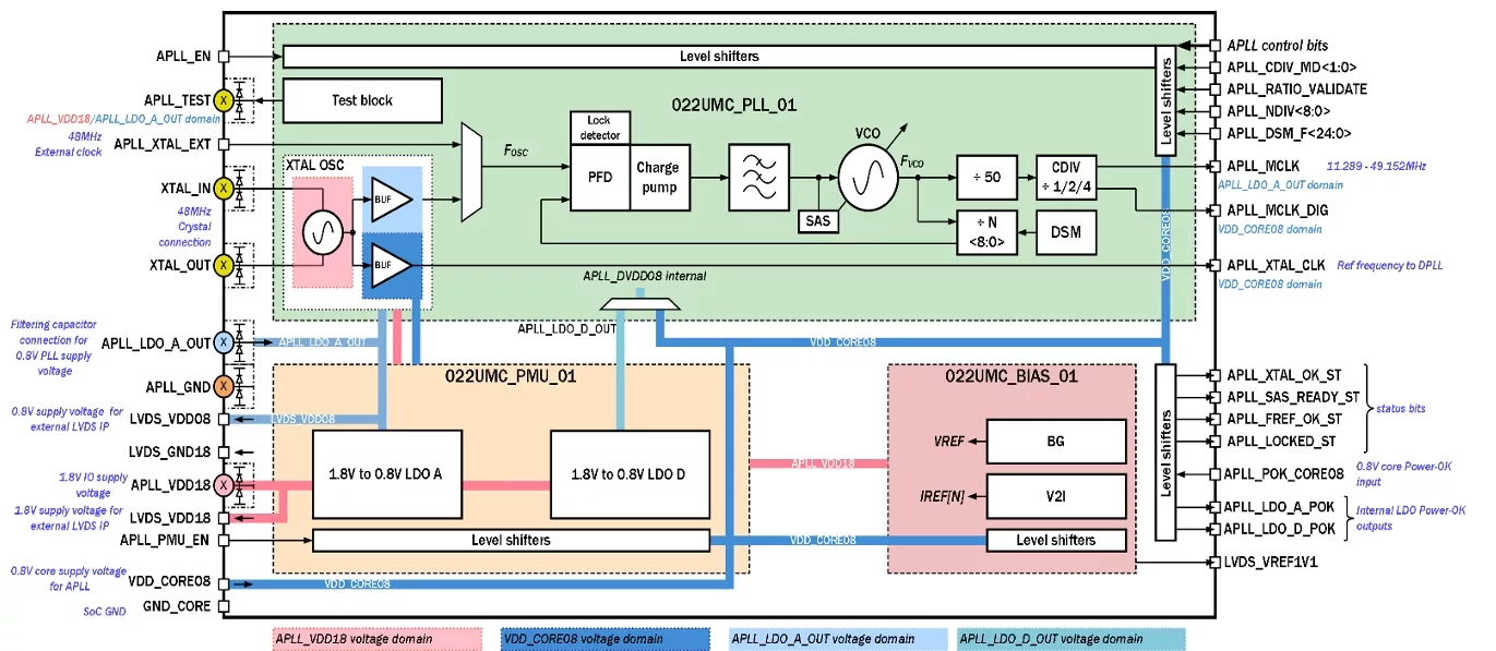 APLL Fractional-N phase locked loop frequency synthesizer is intended for SoC clock generation and embeds a reference 10MHz – 50MHz XTAL oscillator, which is also able to work as an input signal buffer in the same frequency range. The internal 2.5GHz high frequency VCO provides both excellent phase noise performance and ultra-fine frequency tuning step. The PLL is supplied from 1.8V input voltage down converted by embedded LDOs with low noise and high PSRR. The embedded Bias block provides a low noise and high PSRR voltage and current references to PMU, PLL core and XTAL blocks, as well as it outputs a voltage reference 1.0V for external purposes with up to 10uA load.