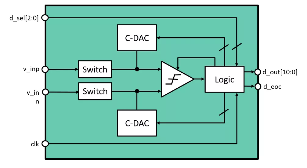 The ADC IP is a general-purpose successive approximation converter for low-power medium resolution applications.