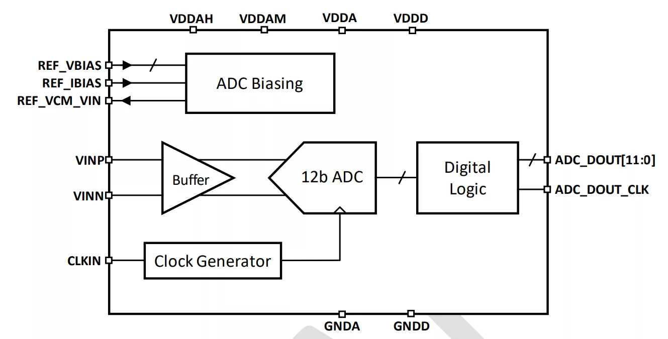 The ADC architecture is optimized to maximize performance while minimizing power and area consumption. The ADC includes an integrated input buffer.
