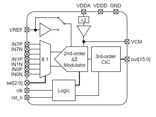 The IP integrates a reference voltage buffer and common-mode generation. It requires an external clock of 8 MHz for 4 kSps data rate. A slower clock may be used to reduce power consumption.