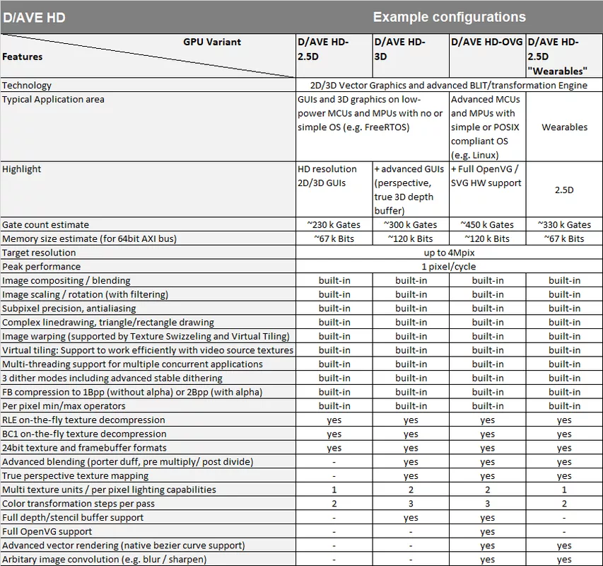 The D/AVE HD 2.5D GPU family is an evolution of the D/AVE 2D family supporting high quality 2D and 3D rendering for displays up to 4K x 4K. Targeting modern graphics applications on high resolution displays in the Industrial, Medical, Military, Avionics, Automotive and Consumer markets, the D/AVE HD fixed-function 2.5D GPU core is designed to be fast with powerful functionality. In addition, it is configurable regarding feature set versus footprint. The resource optimized variants are the ideal choice e.g. for feature rich wearables, smart watches and IoT devices with animated vector graphics 2D and 3D GUIs, while the fully featured variants target performance demanding graphics in professional and high-end consumer electronics applications including full OpenVG 1.1 vector graphics support.