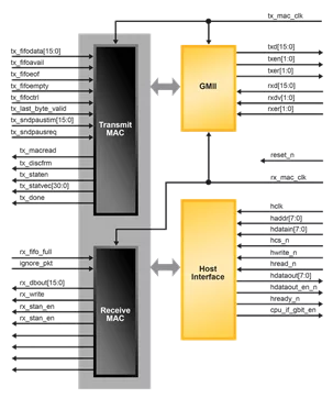 On the transmit side, the Tx MAC is responsible for controlling access to the physical medium. The Tx MAC reads data from an external client Tx FIFO, formats this data into an Ethernet packet and passes it to the GMII module.