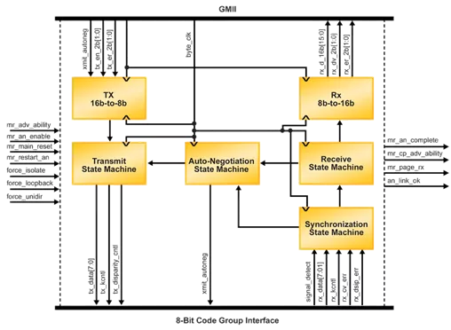 The 2.5 Gbps Ethernet PCS IP core converts GMII frames into 8-bit code groups in both transmit and receive directions and performs auto-negotiation with a link partner as described in IEEE 802.3z specification.