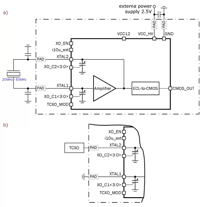- Two modes: quartz mode (XTAL) and internal generator mode (TCXO)