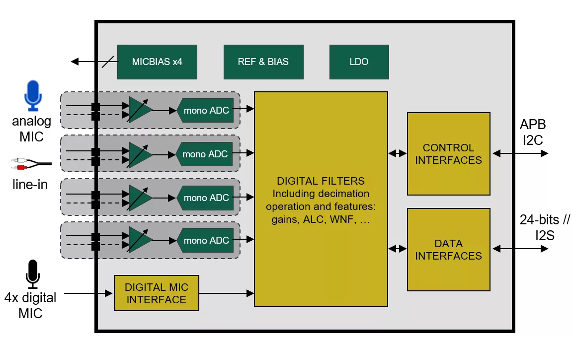 24-bit Cap-less ADC 106 dB SNR low power and low latency 4 channels