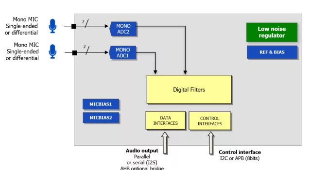 The mADC107-BW1.01 is a mixed (analog and digital) Virtual Component containing one mono ADC, and additional functions offering an ideal mixed signal front-end for low power, fast wake-up and high quality audio applications. It can also combine ultra low latency capability for ANC applications.
