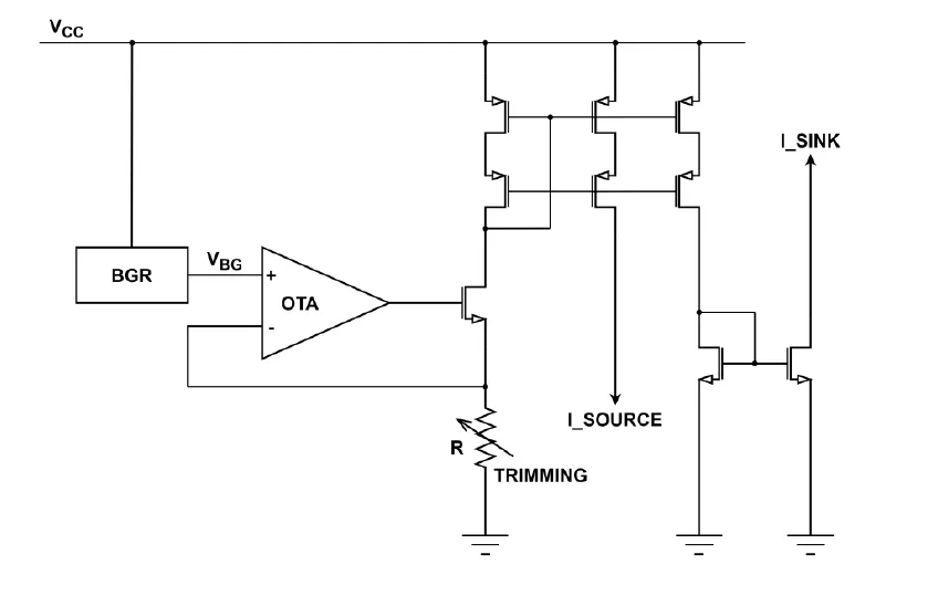 The TS_IREF_88uA_X8 is a current reference biasing circuit which provides a sink/source ZTAT (zero-toabsolute temperature) temperature-independent current from 250nA up to 88μA and supplied with 3.3V. As shown in Figure 1, the current reference circuit consists of a bandgap circuit generating a ZTAT voltage 𝑉𝐵𝐺 and by using an OTA, an NMOS transistor, and a trimmed P-doped poly resistor (temperature independent), a ZTAT current can be generated and copied using current mirrors. The bandgap voltage 𝑉𝐵𝐺 is also provided as an output in case it is needed as a reference voltage. Digital trimming is available for the generated current through trimming bits. The current reference also provides an Enable signal to control whether to turn on or shutdown the bandgap circuit and consequently the biasing circuit.
