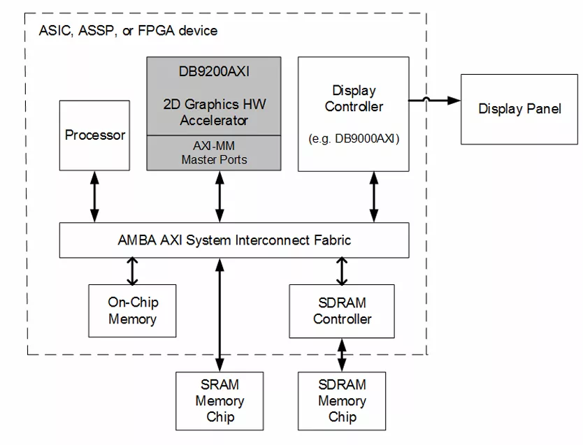 The Digital Blocks DB9200AXI 2D Graphics Hardware Accelerator / Engine Verilog IP Core renders graphics frames as follows: Genera…