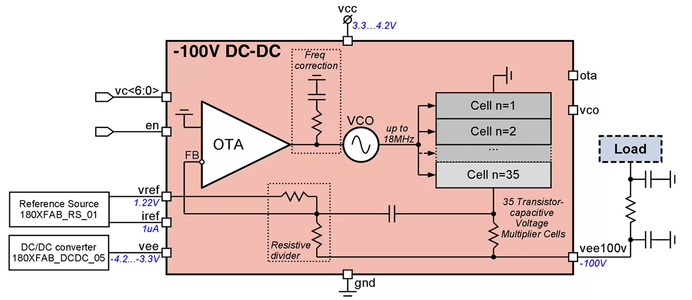 180XFAB_DCDC_02 is a DC/DC step-down voltage converter that generates -100V output voltage from 3.3V to 4.2V power supply. The output voltage can be smoothly adjusted from 0V to -100V. The DC/DC converter contains of OTA and transistor-capacitive voltage multiplier cells. The block is designed for 44uA current consumption for 3.7V input voltage and -100V output voltage. Output current and current consumption decrease with output voltage increasing. It will take 20ms to charge external 22nF capacitor from 0 to -100V.