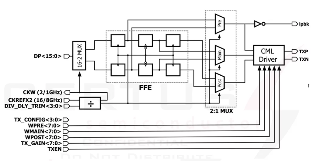 - TX Interface: 16-bit parallel input-> differential serial output