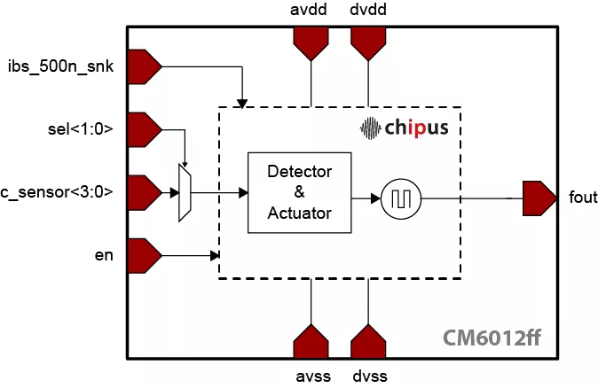 The CM6012ff is a touch sensor implemented in Silterra D18V technology, using 5V devices for the analog section and 1.8V devices for the digital section.