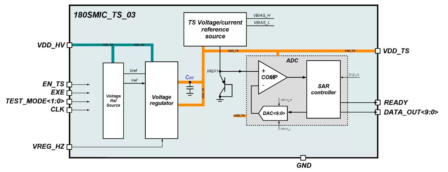 The 180SMIC_TS_03 is a unique stand-alone solution intended to continuously monitor IC status. Temperature detector consists of temperature sensor unit (the voltage at which is directly proportional to the temperature), analog core, SAR controller as calculation center for temperature measurements, as well as an internal voltage regulator, with an output level of 1.25V.