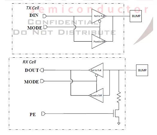 This silicon proven die to die interface includes IP in both TSMC 16nm FFC/FFC+ and 28nm HPM/HPC/HPC+. The I/O cells for both versions of the library are defined as TX only and RX only. The cells have two modes of operation: standard full rail to rail swing or a custom low noise psuedo-differential interface. The RX cells have a weak pull-down feature. The library is designed for Flip-chip/Die to Die packaging only, with no Wirebond option. Both library options have a common power bus architecture that when the cells are abutted, will feed through. There are no Power or Ground Pad/Cells, however all VDD and VSS connections will be made to the Core domain in upper metals. Both library options are ultra-low power, have a small footprint, MCM compliant, and have HBM & CDM robustness.