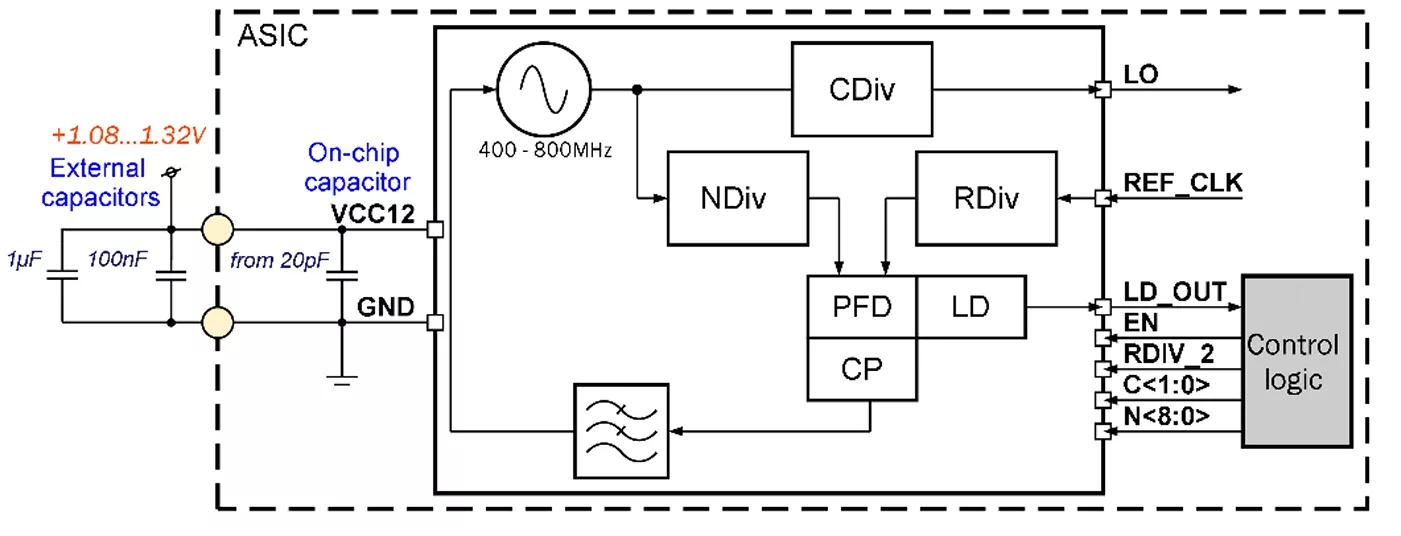 055SMIC_PLL_01 forms clock output signal with frequency from 50 to 800MHz. It consists of the ring VCO with frequency from 400 to 800MHz, a programmable feedback divider, a low noise digital phase noise detector (PFD), a precision charge pump (CP) with internal loop filter, lock detector (LD) and programmable clock divider to obtain a required output frequency. LO output signal is CMOS compatible.
