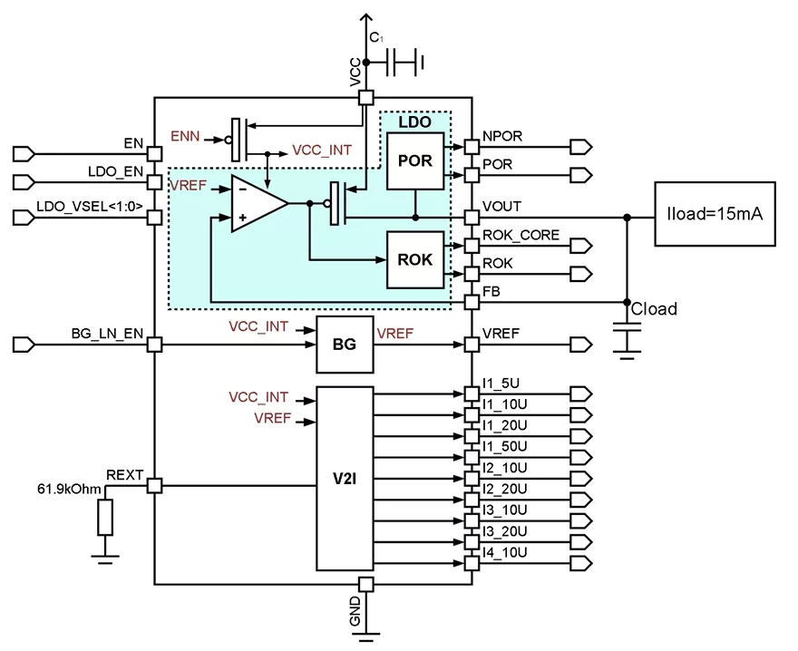 5mA LDO voltage regulator (output voltage value 1.15V/1.2 V/1.25V/1.3V) with BG (0.6V) and I2V (5uA, 10uA, 20uA, 50uA)
