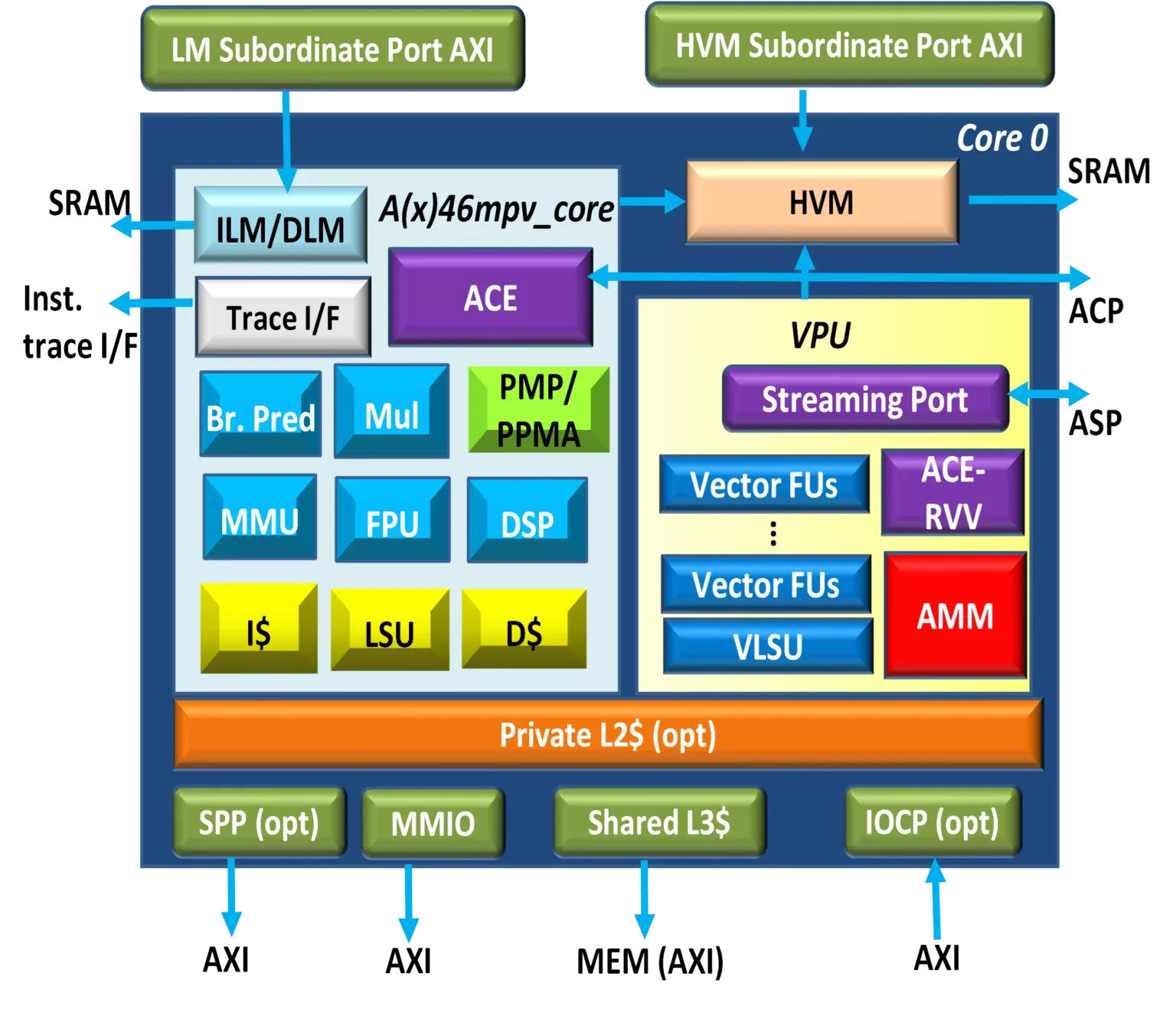 BUS Subordinate Port: AXI with 128/256/512-bit data, for ILM/DLM accesses Efficient data transfer between CPU and SoC masters