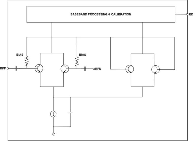 The WEA7681PD22G is a single ended detector of 100 mV to 900 mV output voltage. It has a differential input and is capable of detecting signals over two dynamic ranges, from –1 dBm to 14 dBm and from 5 dBm to 20 dBm. It consists of 2 parts, the RF part and the Analog processing part. The baseband part is used as an amplification stage for the RF part.