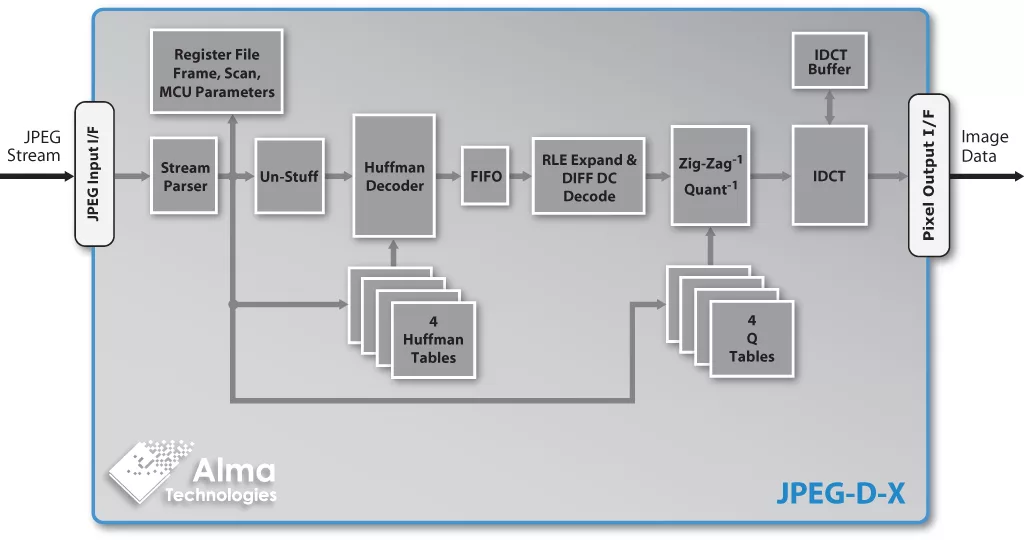 The JPEG-D-X core is a standalone and high-performance JPEG decoder for still image and video compression applications.