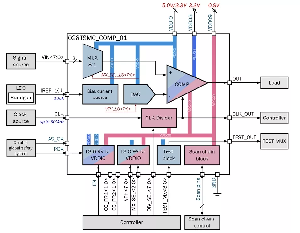 The Comparator operates from analog VDDIO 3.3V/5.0V, VDD33 3.3V and digital voltage VDD09 0.9V. Bias currents should be delivered from an external source.