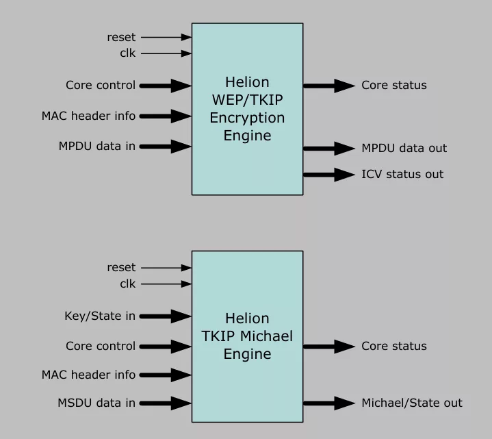 The Helion WEP/TKIP Encryption engine is a standalone high-speed processing core which is designed to encrypt and decrypt 802.11 MPDU data, based on an underlying ARC4 stream cipher. It includes all the defined keymix processing as well as the MPDU payload encryption/decryption functionality.