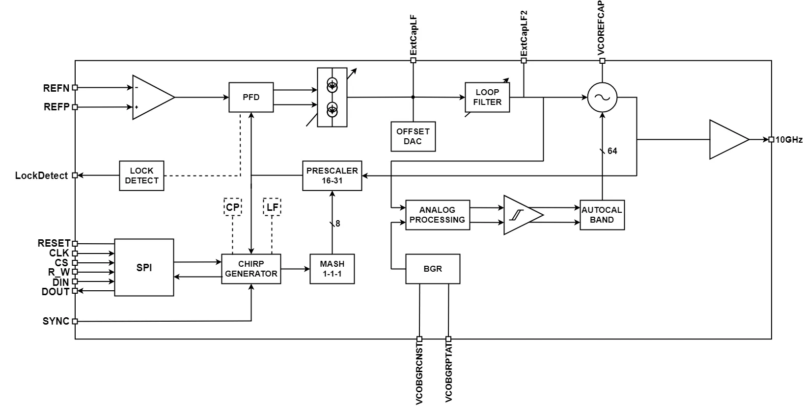 - 125 MHz tuning range per Band, Lock time <1 us, Chirp ramp < 10 us, FM Chirp Linearity error < 1%