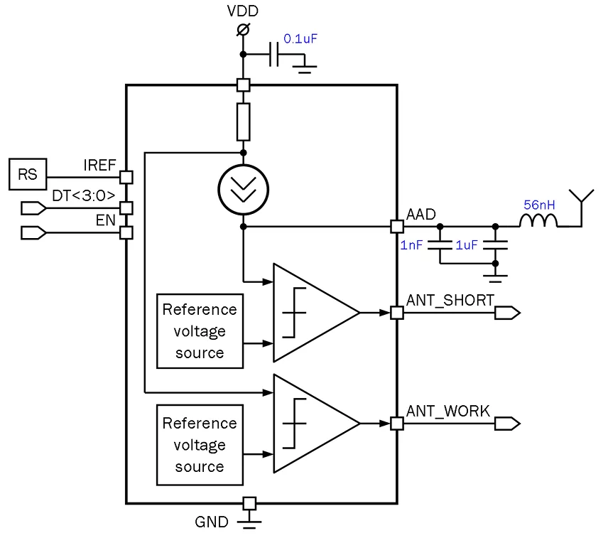 The antenna detector supplies an active antenna and is able to detect both open and short circuits. A current limiter restricts the antenna current to a safe level in the case of a short circuit in order to protect the circuit. Detection current is 1...16 mA. Short circuit protection current is 4...64 mA. Supply current is 140 uA.
