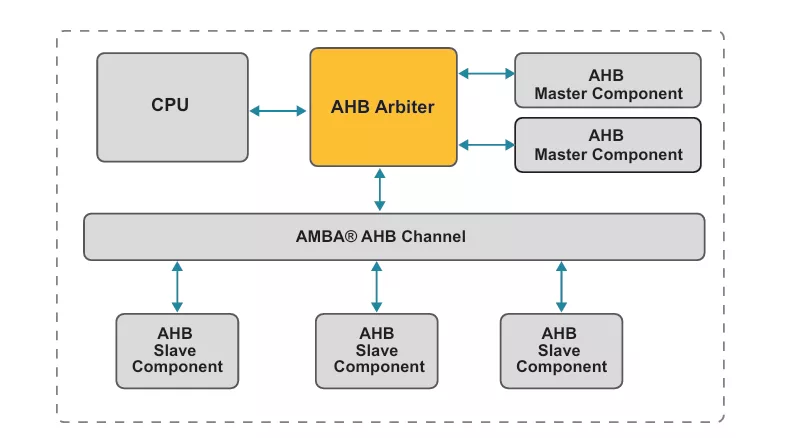 The AHB Arbiter has four distinct Mirrored-Master component Ports, each of which can be connected to an AHB Master components (e.g. a processor or a DMA Controller), and one Port that connects to an AHB subsystem, typically through an AHB Channel module.