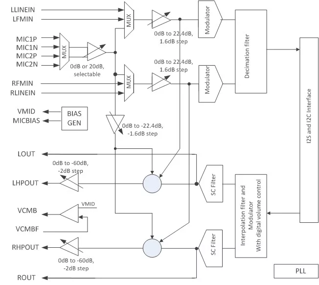 This audio codec integrates 2-channel 24-bit sigma-delta ADCs and 2-channel 24-bit sigma-delta DACs, and fractional audio PLL to support a wide range of sample rates. The input paths support stereo FM/LINE input, two analogue and two digital microphones. The output paths support stereo line output and stereo headphone output. It is suitable for low power portable audio applications.