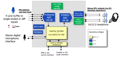 mono DAC with headphone amplifier, and additional functions offering an ideal mixed signal front-end for low power, fast wake-up and high quality audio applications. It combines also ultra low latency capability for ANC applications.