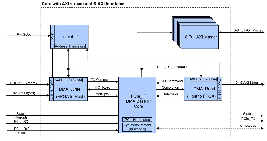 The AXI Bridge with DMA IP core is the ultimate PCIe DMA IP solution with a powerful mix of multiple industry standard AXI Interfaces. AXI Stream interfaces allow continuous data streaming from FPGA to Host or from Host to FPGA. S-AXI Memory mapped interfaces allow easy data access of remote memories in order to realize shared memory access or per to peer applications.