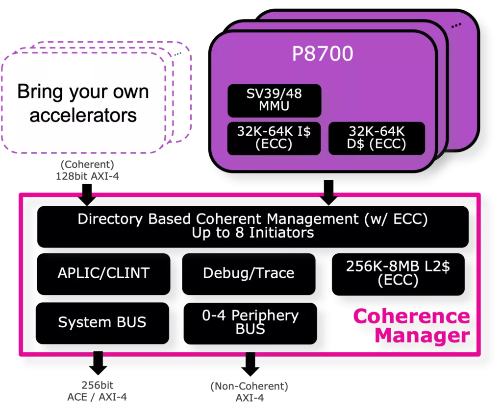 The MIPS Coherence Manager has an AMBA® ACE interface that enables the P8700 Multiprocessing System to coherently scale up to 64 heterogeneous clusters at the system-on-chip (SoC) level with each cluster supporting of up to 6x P8700 cores each, with up to 2 hardware threads per core.ation with heterogeneous CPU clusters and other accelerators at the system-on-chip (SoC) level.