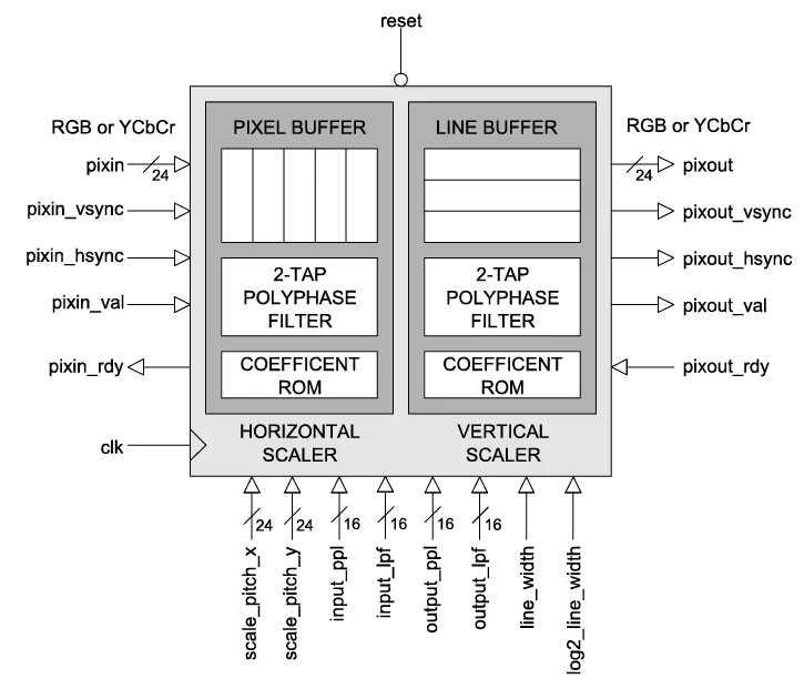 - Output rate is 1 x 24-bit pixel per clock for scaling factors > 1
