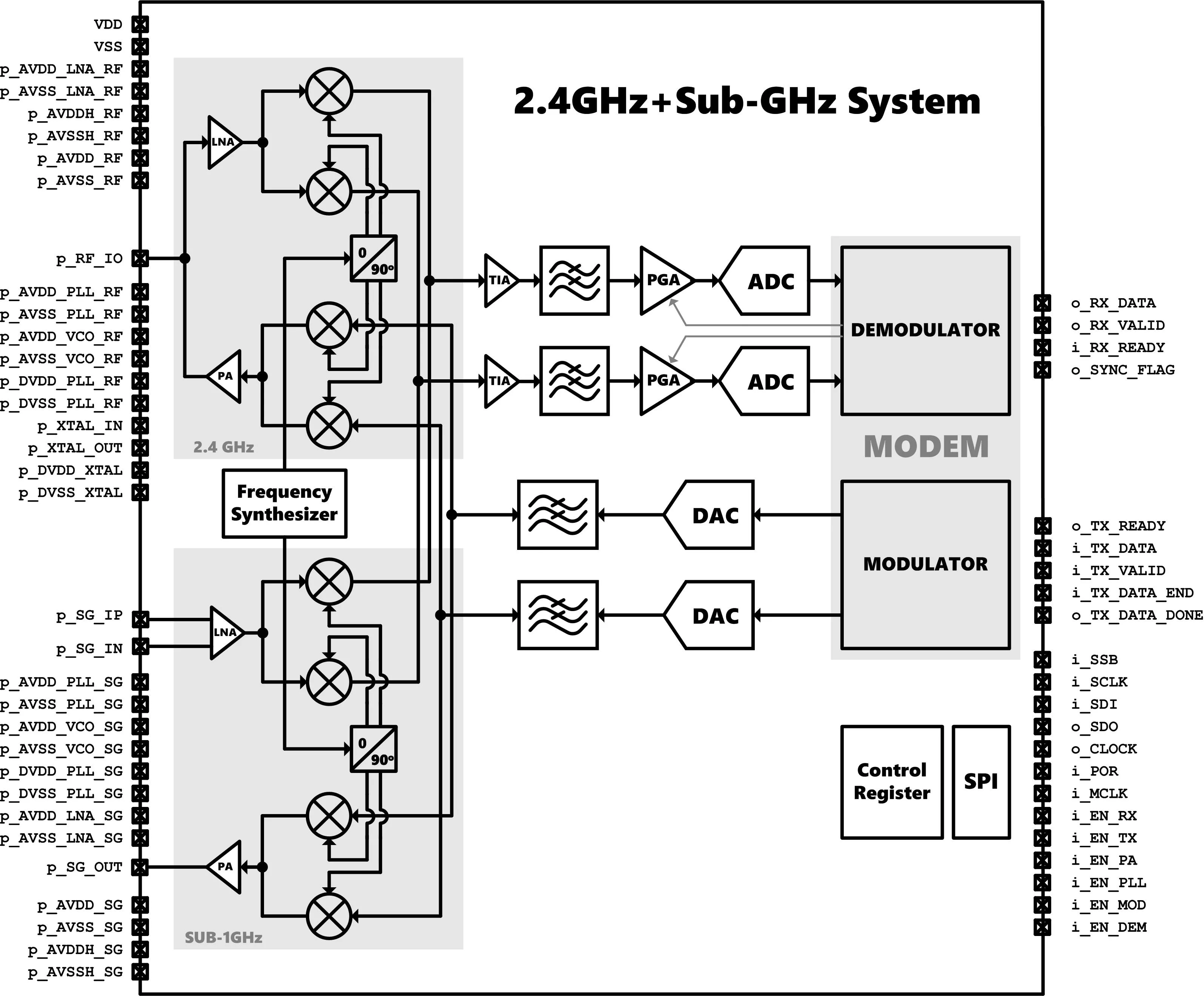 The BLE5ZSUBGS40LP RF IP is designed for SMIC 40nm LP Process. It is a cost-effective low power dual-band communication sub-system. It integrates TX/RX Radio (Sub-GHz, BLE 5.0, and Zigbee proprietary solutions), 802.15.4g compliant PHY and low level MAC. BLE5ZSUBGS40LP supports multiple Sub-GHz frequency bands and 2.4 GHz. The optimize modulation provide the good sensitivity in Sub-GHz, Zigbee, and Bluetooth 5 LE solution. The long range mode in Sub-GHz can transfer data over 2 KM.