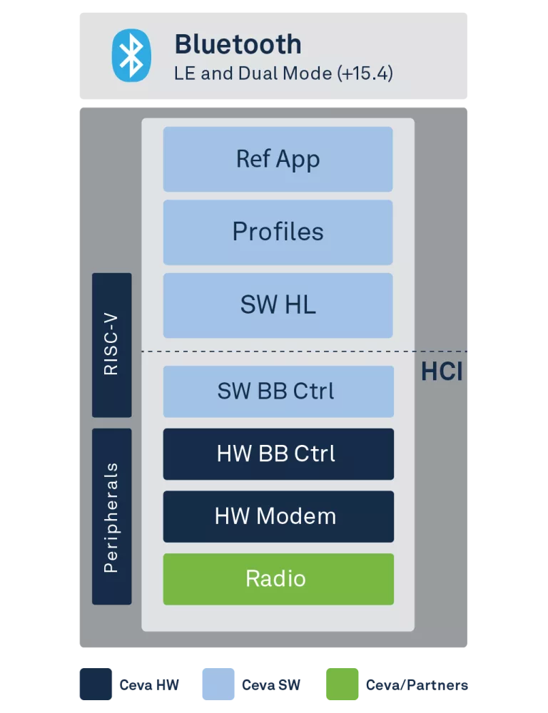 The Ceva-Waves Bluetooth platform includes field-proven hardware IP for baseband controller, modem, and 2.4 GHz RF transceiver functions, and allows use of many third-party radio IPs as well. The platform includes optimized baseband controller hardware and software, and above the Host Controller Interface (HCI) a host-agnostic software protocol stack supporting all major Bluetooth profiles. The built-in 802.15.4 add-on suite shares the same Bluetooth radio, and includes IEEE 802.15.4 MAC & modem hardware IP and software, and is compatible with Zigbee, Thread and Matter host protocol stacks.