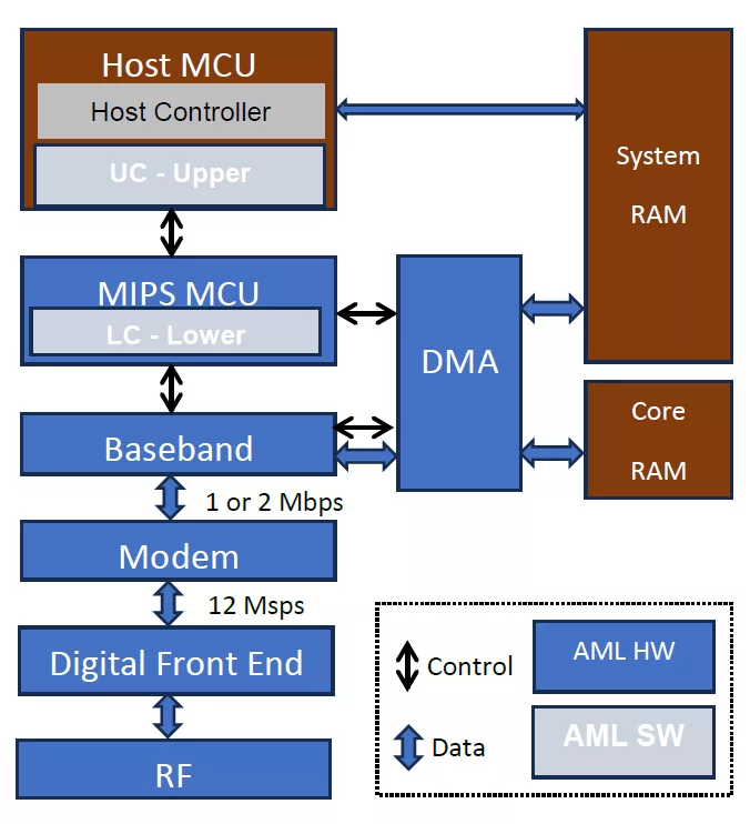 SB1001-CM is a full single-source BLE 6.0 Subsystem IP, consisting of an integrated Controller and Modem.