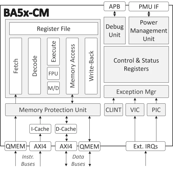 The core’s small silicon footprint, starting at 90k gates, minimizes leakage currents while idle and reduces dynamic power consumption. The BA5x-CM also features low-latency and predictable-time interrupt response thanks to its VIC (Vectored Interrupt Controller), which supports up to 64 interrupt sources. Additionally, the BA5x-CM is also equipped with a configurable size (up to 64 kB) and associativity (up to 4-way) instruction and data caches, to reduce instruction and data fetch latency and power consumption, and improve performance when executing from a slow or high-latency memory (e.g., off-chip flash memory, or DRAM).