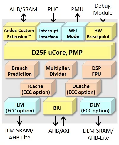 AndesCore™ D25F is a 32-bit CPU IP core based on AndeStar™ V5 architecture which incorporated RISC-V technology, it is capable of delivering high per-MHz performance and operating at high frequencies, at the same time it is small in gate count. D25F also supports the RISC-V P-extension (draft) DSP/SIMD ISA contributed by Andes, and single-/double-precision floating point and bit-manipulation instructions. D25F comes with options, including branch prediction for efficient branch execution, Instruction and Data caches, Local Memories for low-latency accesses, ECC for L1 memory soft error protection, and Andes Custom Extension™ (ACE) to add proprietary instructions to accelerate performance/power consumption critical spots.
